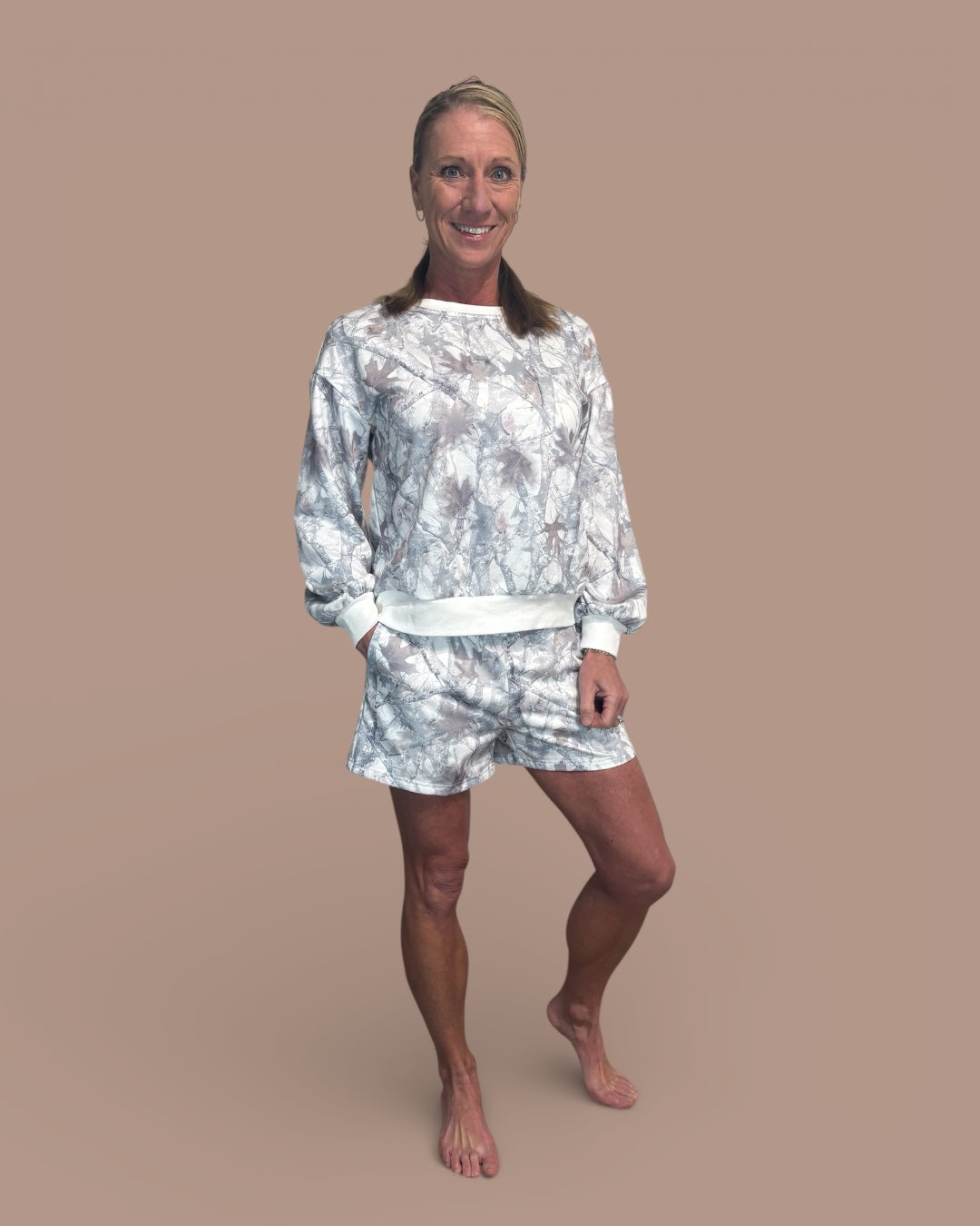 An easy, fashion-forward lounge set with a cool, everyday camo vibe. The Cool Camo Set features a lightweight pullover paired with matching drawstring shorts in a soft, abstract woodland camo that feels casual, modern, and wearable.