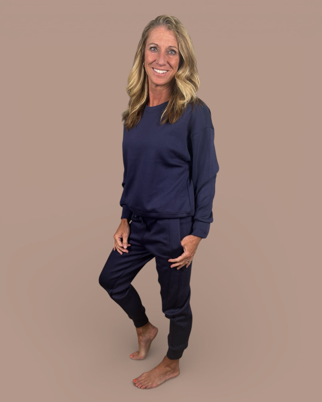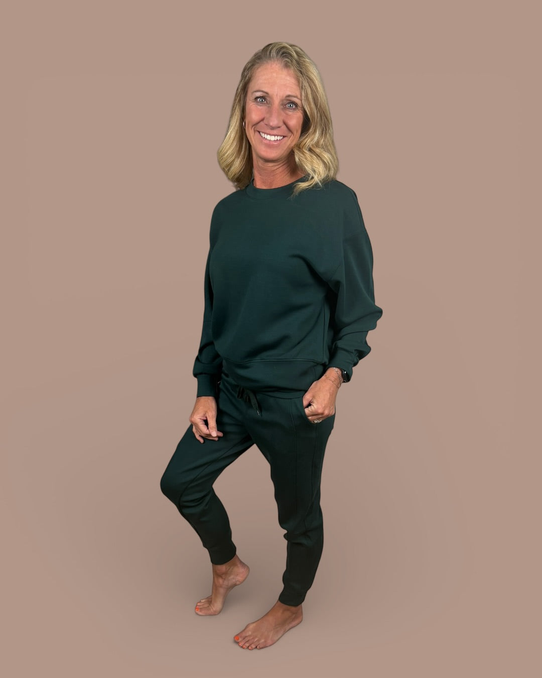 This set is pure happy, it instantly brightens your day and somehow still feels cozy and relaxed. The sweatshirt has that easy, lived-in fit you want for everyday wear, and the joggers are comfy without looking sloppy. It’s one of those outfits you throw on and immediately feel put together, whether you’re at home, running errands, or meeting friends. Soft, flattering, and just really fun to wear.